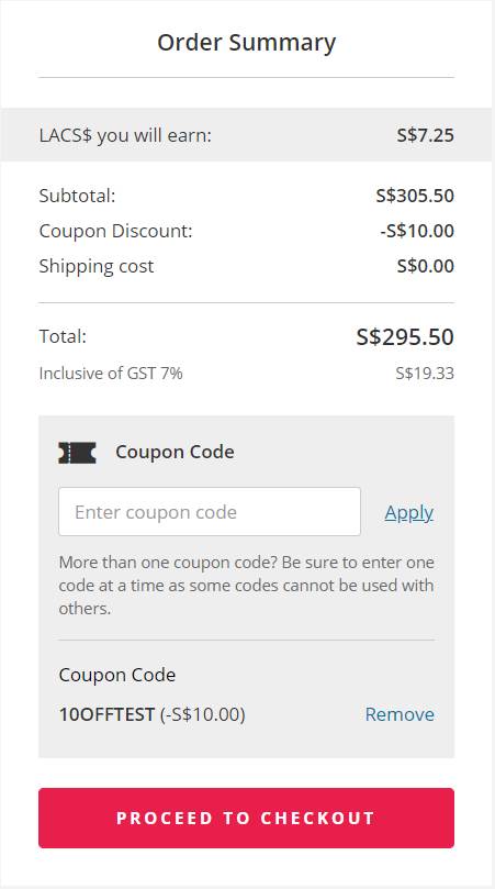 若使用優惠券代碼,折扣金額將反映在訂單摘要的小計下方。
